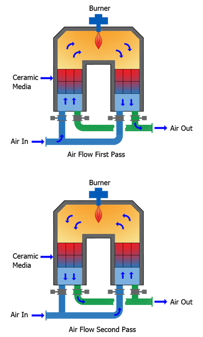 After operating for several minutes, the hot ceramic media will cool and to maintain the efficiency, the direction of the gas is reversed so that the gas now passes over the previous exhaust side media and is heated. By continually switching the direction of the gas ever few minutes, the different beds are kept relatively warm and efficiencies of 80%, 90% or higher percent thermal efficiency can be obtained.
