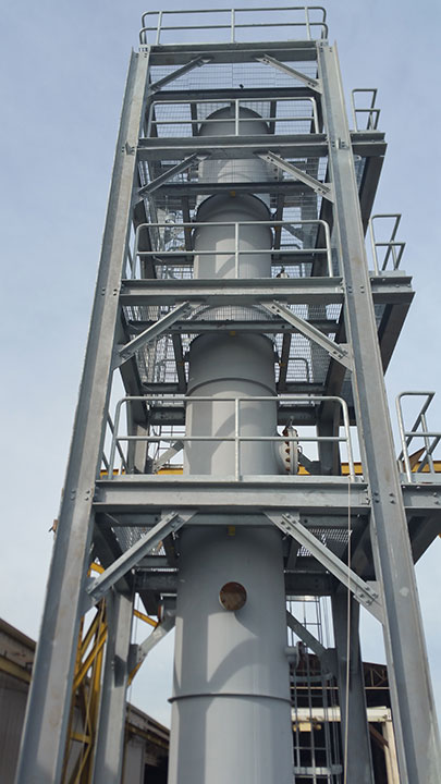 Because of the relatively high temperatures and pressures of operation, Steam Strippers are normally fabricated from Steel – since no oxygen is present. The upper chamber where the water first enters however can see higher concentrations of oxygen and is typically an Alloy such as a Duplex Stainless Steel. The internal trays are typically 316 Stainless Steel.