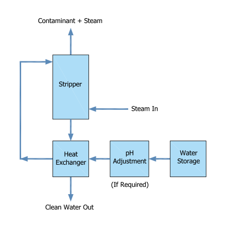 Organics such as Benzene, Toluene, and Xylene can be stripped from water using steam. The resulting vapor is then condensed and the organic layer separated. The condensed water is then returned (reflux) to the stripping column where it is cleaned again.